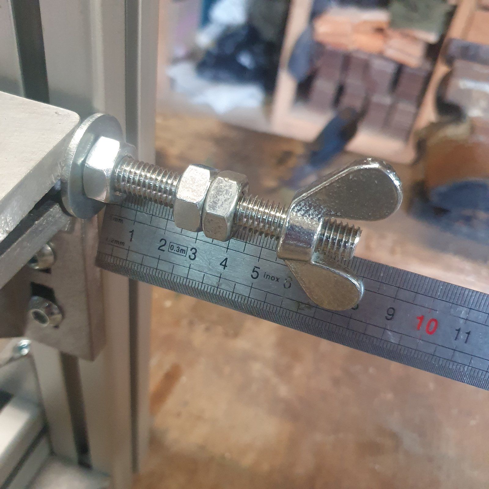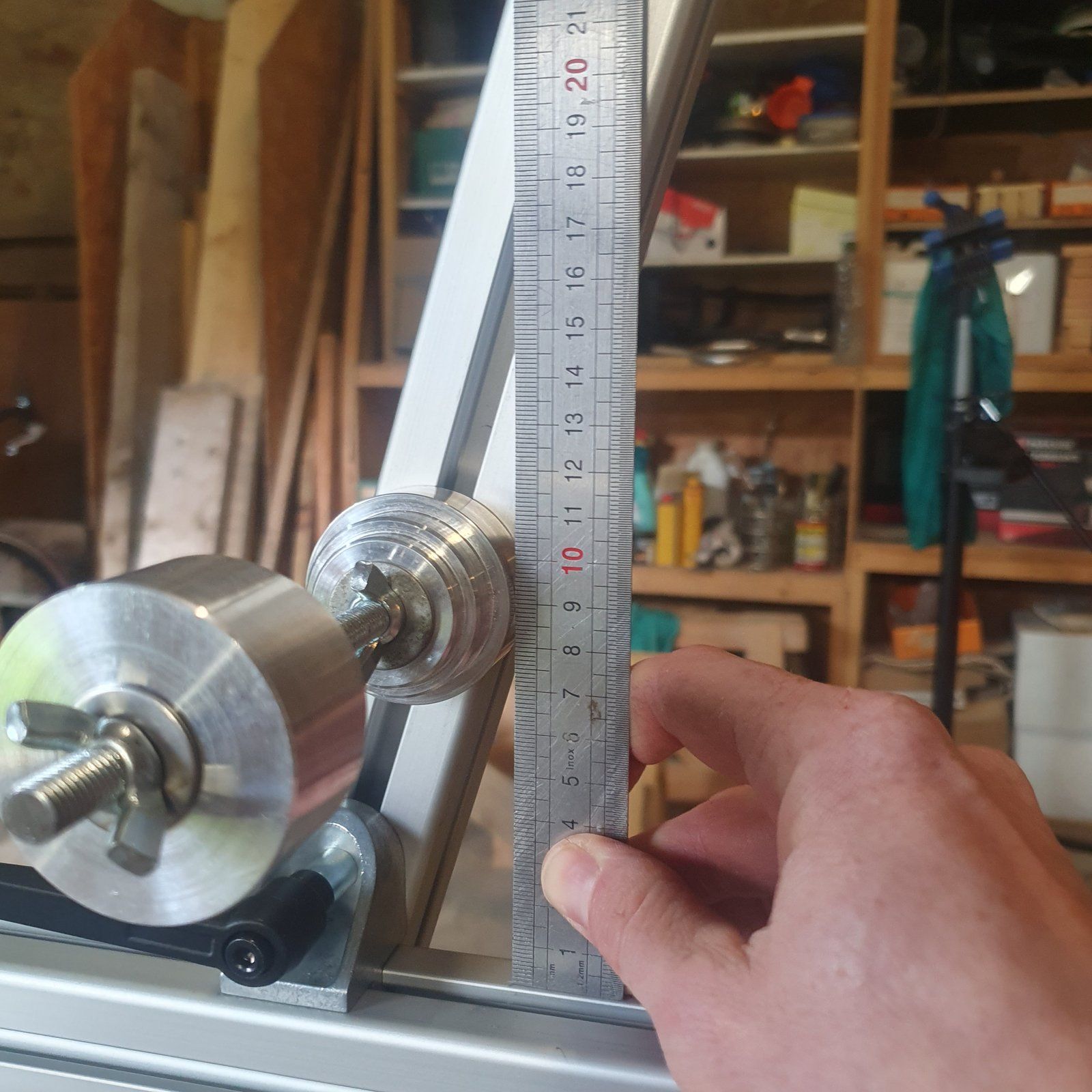 Je passe rapidement sur le réglage du faux-axe : écrou et contre-écrou pour servir de butée entre les pattes. Avec quelques soustractions, j’ai pu établir des mesures à régler non par rapport au milieu de l’axe, mais par rapport au bord du profilé : c’est plus pratique pour y appuyer mon réglet.