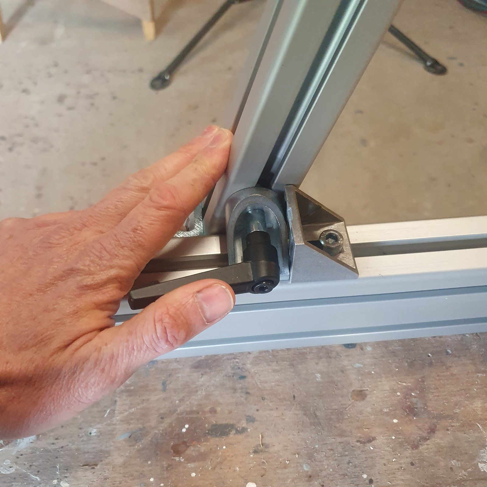 Par contre j’étais pas certain que des profilés de 40x40 mm suffisent à garantir une bonne régularité du plan de travail. Surtout avec des profilés de cette longueur.J’ai donc commencé par ajouter un montant fixe sur la gauche – comme ils le suggèrent eux-mêmes – et j’ai surtout doublé la largeur des traverses (80x40mm), en conséquence de quoi la surface d’appui des montants sur les traverses s’est trouvée doublée aussi, pour une meilleure planéité de l’ensemble. Et puis j’ai blindé les assemblages des montants sur les traverses : trois équerres à chaque coin pour assurer à la fois que l’équerrage du châssis ne bouge pas et que les montants soient bien plaqués contre les traverses.